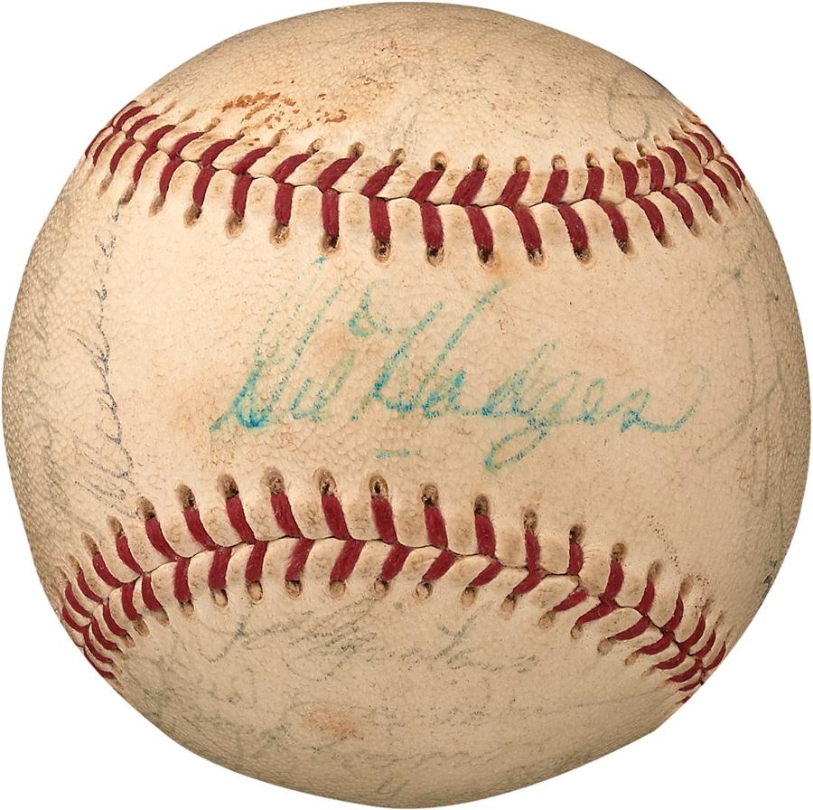 Step right up and greet the Mets! From the Amazin' 1969 season comes this team-signed official National League (Warren Giles) baseball that features 30 signatures, including: Hodges (ss), Ryan, Seaver, McGraw, Koonce, Agee, Jones, McAndrew, Koosman, Harrelson, Pignatano, Dyer, Grote, Kranepool, Boswell, Garrett, Swoboda, Shamsky, Martin, Gentry and more. Hodges - the skipper for that miracle team that shocked the Orioles in the World Series - highlights the ball with one of the clearest signatures.