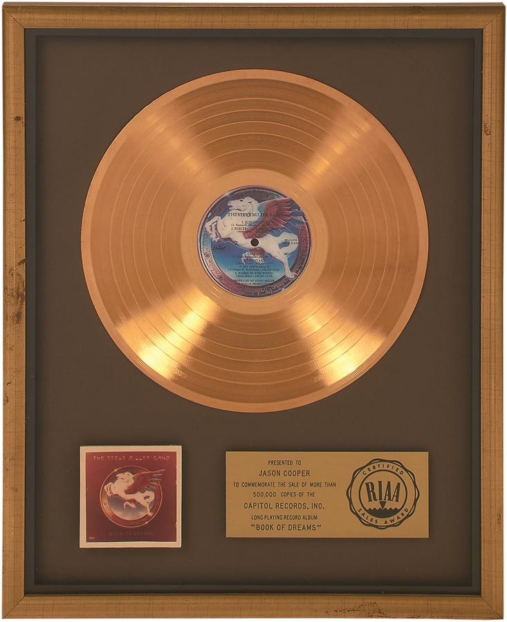 This Gold Record award was presented to Jason Cooper, who was the agent at Creative Arts Agency (CAA), to commemorate the sale of more than 500,000 copies of Capital Records "Book of Dreams" by the Steve Miller Band. Officially issued by the RIAA, it dates from the late 1970s. This was for the band's 10th album, which was critically acclaimed and had memorable artwork of Pegasus in flight. There is a label for "Wood Street Frame Shop" on the back, it measures 17x21.5" and is in EX-MT condition.