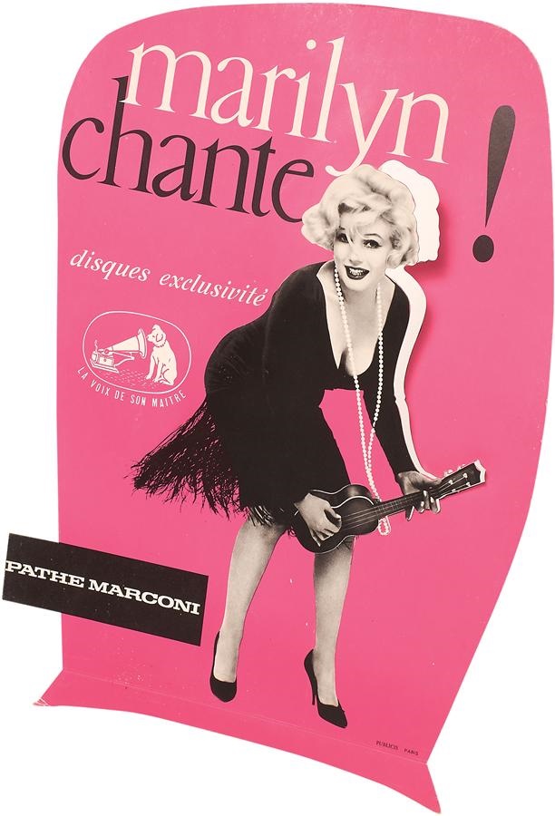 This cardboard advertising display is probably one of the rarest, most striking and unique Marilyn Monroe advertising pieces in existence. It features an iconic photo by Richard Avedon that has Marilyn in a snug black dress as a silhouette in relief (her form pops out as a three dimensional image) against a hot pink background. For Billy Wilder's masterpiece, Some Like it Hot, Marilyn "Chante Diques Excusivitie" promotes Pathe Marconi and "His Mater's Voice in French." This vinyl EP record is in French for the French market with the image on the EP signed by Richard Avedon. France is a relatively small market compared to the rest of the world, thus, very few displays would have been produced and this one is the only one known to exist. From the EP soundtrack, famous scene where Marilyn plays the ukulele even though everyone knows she's been hired for form over function. This figural die-cut sign with an easel back is high grade NRMT and measures 24x17". This superb copy was found in the vaults of the printer and it was distributed by PUBLICIS FRANCE. Also included is the original EP "Marilyn Monroe Chante" in unused NRMT-MT condition.