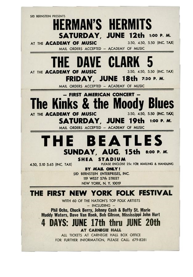 From one of the most historic concerts in history, the 1965 Beatles show at Shea Stadium this is almost as good as a poster but won’t cost you six figures. Folded twice (as they all are) but otherwise in NRMT condition, this beauty measures 8.5x5.5". Other major acts appearing that summer include The Kinks, Moody Blues, Herman's Hermits and the Dave Clark Five, the days when The British Invasion was in full force.