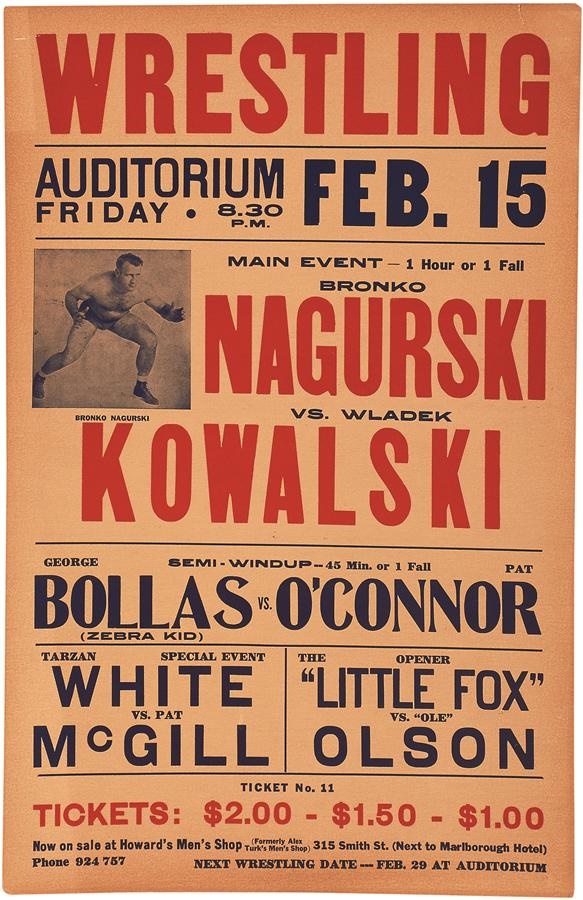 This extremely attractive 1946 window card measures 22x14" in heavy cardboard, boasting creat colors and the definitive image of football-player-turned-wrestler Bronko Nagurski right on the poster. This is from a relatively early match for Wladek Kowalski before they made him a "Killer." Interestingly, this, the only known specimen of this beauty and it is from Winnipeg, especially fitting as Nagurski was Canadian.