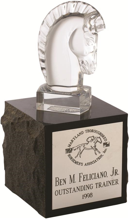 This impressive trophy was presented by the Maryland Thoroughbred Horsemen's Association to important and respected local trainer Ben Feliciano as Outstanding Trainer for 1998. A panel of owners and trainers selected Feliciano because of his pedigree: he was involved in Maryland racing all his life and his success rate was 30 percent. A handsome glass figural horse head atop a heavy granite base, the trophy weighs about 12 pounds, and is 9.25" tall, rating in EX-MT condition.