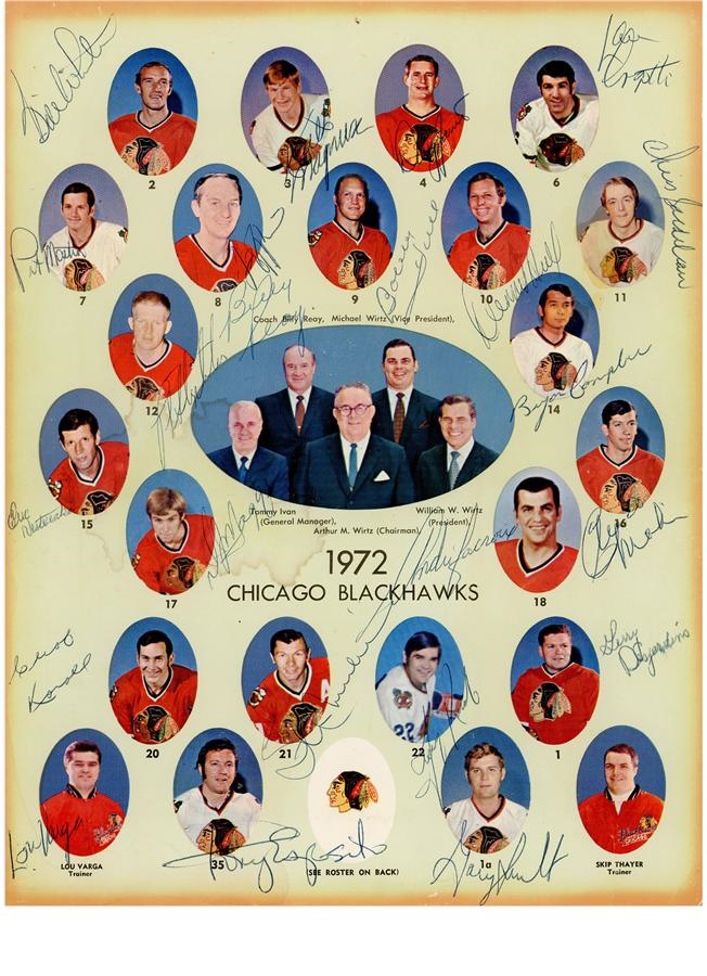 This photo print of the 1972 Chicago Blackhawks includes autographs adjacent to the images. It measures 8.5x11" and has 22 signatures, including three hockey Hall of Fame members - Bobby Hull, Stan Mikita and Tony Esposito. The autographs are vintage, large, in blue ballpoint and stand out well overall, a great presentation. There is some staining but it is only on the back; the front is Excellent or better.