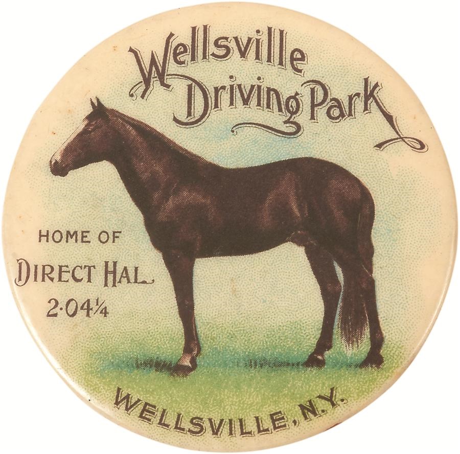 This is a vintage advertising pocket mirror from circa 1900 for a harness horse trotting race track at Wellsville, NY. Of handsome design in celluloid, it consists of excellent structural shape with minor wear, and measures 2" in diameter. Direct Hal had been called the "Horse of the Century," and was greatest horse of his day, a record breaker at 2.04. Excellent condition overall.