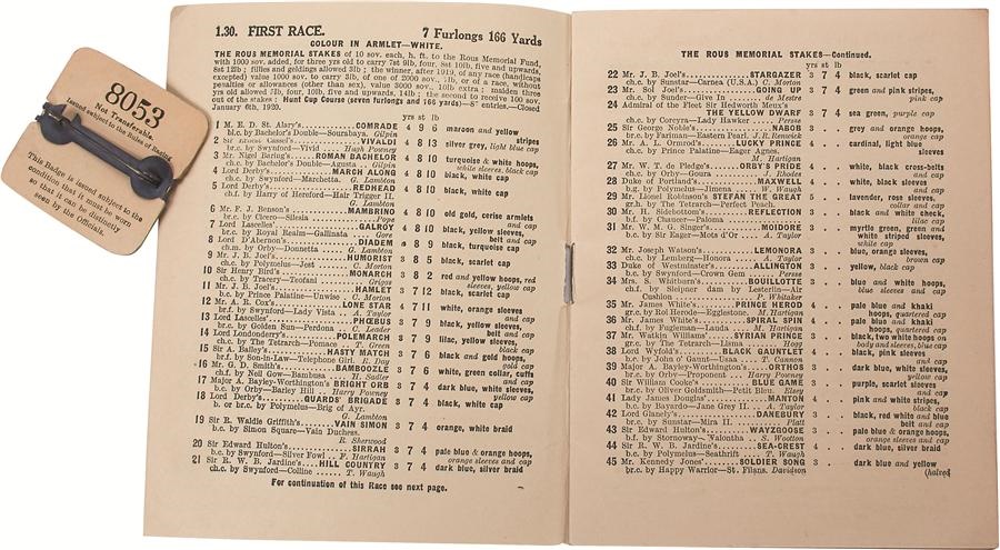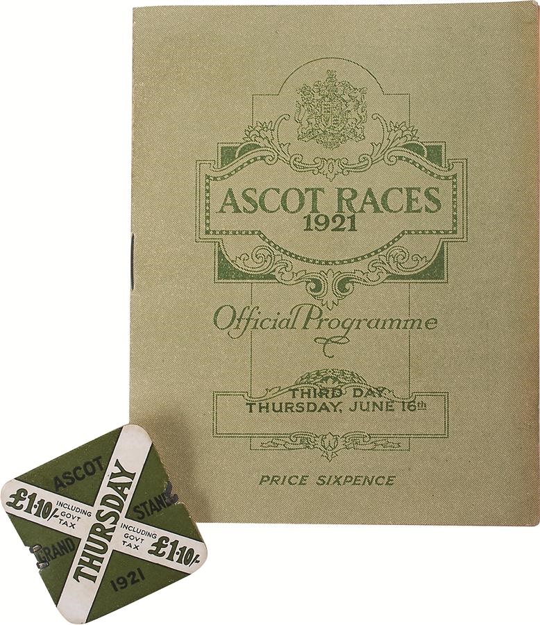 From Britain's most prestigious event for horses, this particular race card is from 1921, representing iconic sprinter Diadem's last race. The booklet is in high grade NRMT condition, as is the cardboard entry badge for the day. Diadem was one of the most brilliant sprinters seen in England for very many years; so important that in 1946 Ascot Racecourse named a new sprint race in her honor, the Diadem Stakes. Spion Kop, the 1920 Epsom Derby Winner, also appears on the racing card. The booklet is 6x4.5" and 16 pages, while the badge is almost 2" with a pinback.
