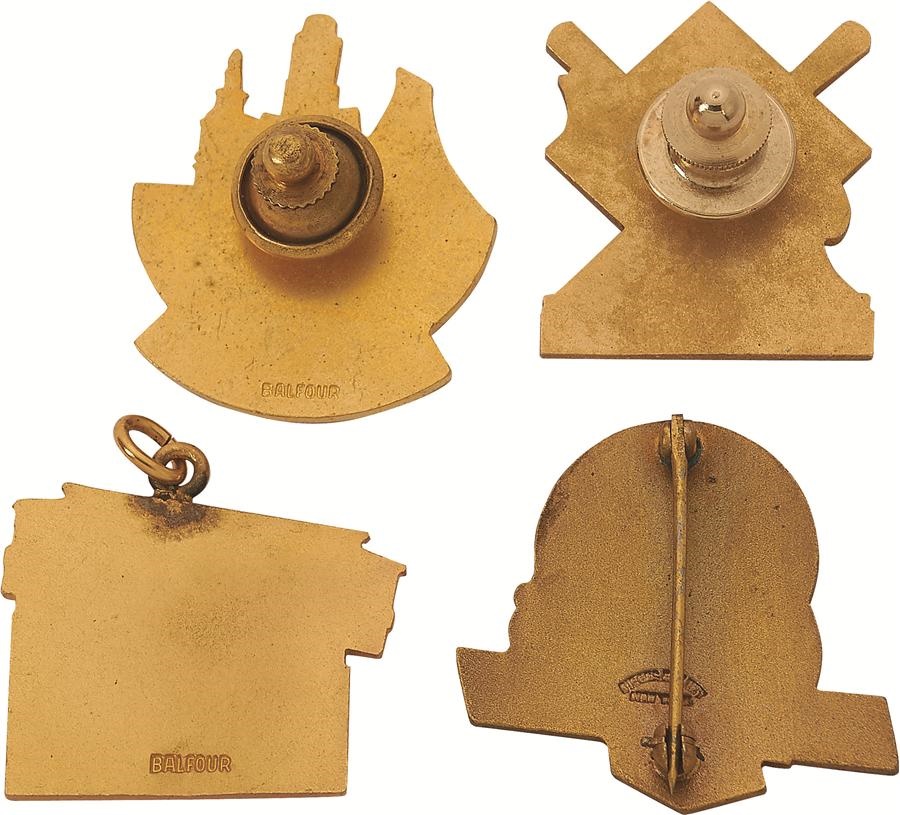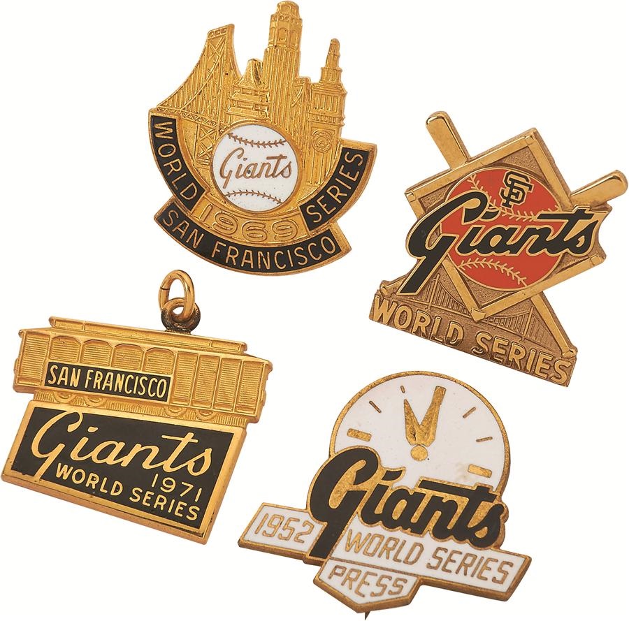 A quartet of collector's Items comprise this intriguing lot. Each of the four press pins included here were created in anticipation of Giants World Series appearances that never materialized. Here's the rundown: 1) 1952 with broach style pin on back with Dieges & Clust stamp. 2) 1969 with needle-style post and Balfour stamp. 3) 1978, also with needle post and no maker's mark. 4) 1971 by Balfour, which is a charm with hanger at the top. All are in NRMT condition.