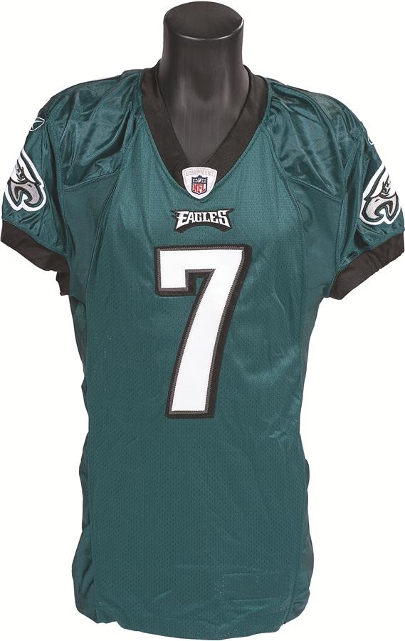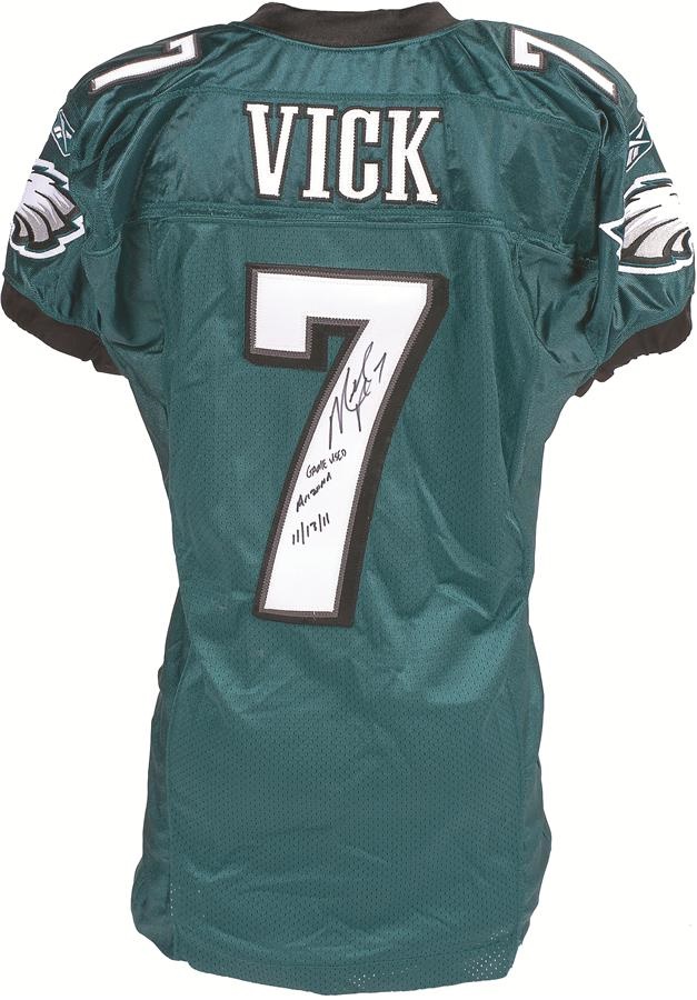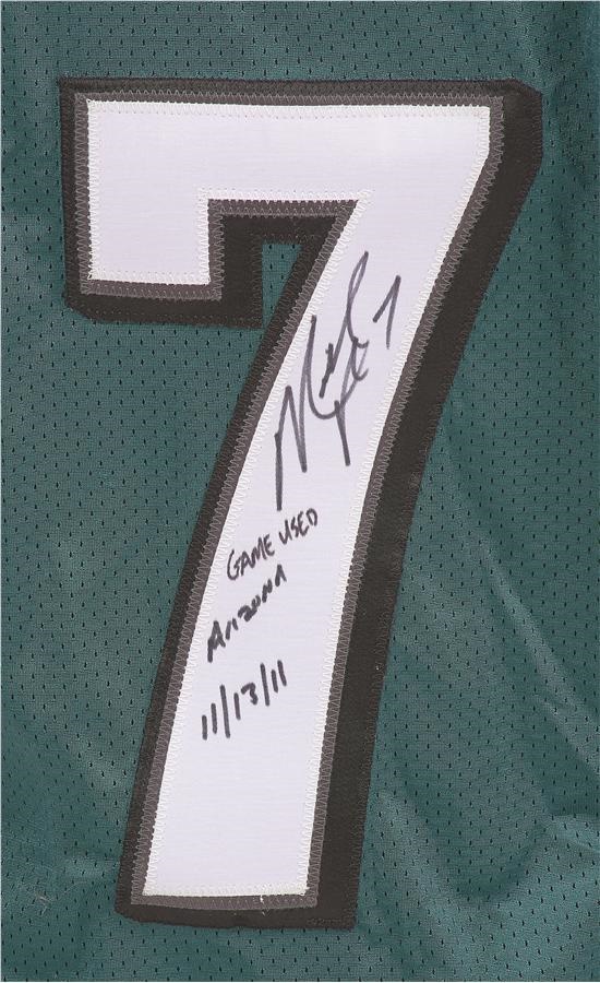 Michael Vick spent five seasons as quarterback for the Philadelphia Eagles, and he wore this original green jersey during Week 10 of the 2011 season, a year in which the former #1 draft pick completed nearly 60% of his passes. It was last worn on November 13 of that season during a 21-17 home loss to Arizona. The tagging in the collar is "06-44 L" (yes, this jersey was held over from 2006 and lettered and issued in 2011). There is also Reebok tagging inside the front tail with Size 44 and 4" L.B. flag tags. Vick's number "7" appears on the front, back and shoulders and the Eagles logos is on both sleeves. The jersey is signed on the back, and Vick also notates "Game Used" with the date of the game. There is light-to-moderate, one-game use.