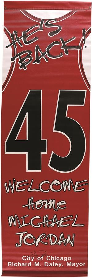 Here's an interesting Chicago Bulls double-sided heavy vinyl banner measuring an expansive 96x30", intended as a street lamp sign, which was issued by the mayor's office of the City of Chicago in anticipation of Michael Jordan's 1995 return to the Chicago Bulls after a one-year hiatus, and hung on the street lamps overlooking the city. This sturdy, bright-red plastic canvas measures more than seven feet in length and is emblazoned on both sides with the words "He's Back" across the top. Jordan's big new number "45" in black with white trim occupies the middle with "Welcome Home Michael Jordan" in white letters with black trim scrawled above an official "City of Chicago Richard M. Daley, Mayor" authorization written at the bottom. Ready to be re-hung with looped ends for dowel inserts and aluminum circle wall-hanging rivets. One side features a Michael Jordan autograph in black Sharpie (which may not be authentic), the banner is in EX-MT condition.