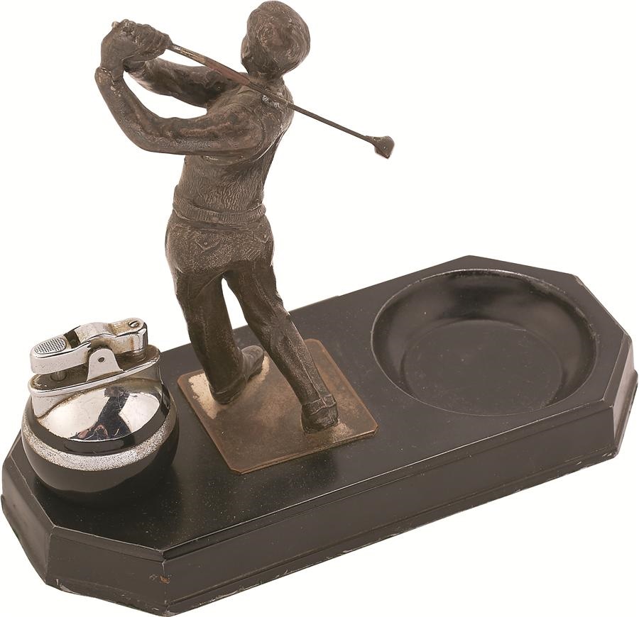 Spectacular art deco, this figural golfer is a scarce lighter made by Ronson. It measures 7x7", and on the metal plate is inscribed, "1934 Art Metal Works Newark NJ USA.", featuring a plated cast metal golfer in mid-swing with high Art Deco black and chrome circular lighter with a design and construction in sync with the 1930s period. The display has a matching black metal base.