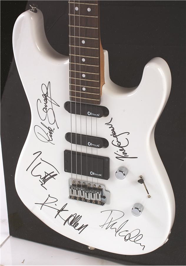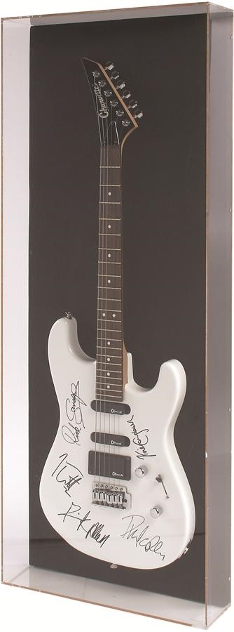 This beautiful Def Leppard signed Charvette guitar is housed in a plexiglass display, and was signed in person for KISS 108 owner Richie Balsbaugh. Five bold signatures in black marker on the white body are from the members who have carried the band's banner since 1992: Joe Elliott, Rick Savage, Rick Allen, Phil Collen, and Vivian Campbell. Dark wood grain neck and black headstock perfectly contrast the pristine white of the body, making this a classic electric guitar. The display case measures 43.5x17.5", a piece that will rock for ages.