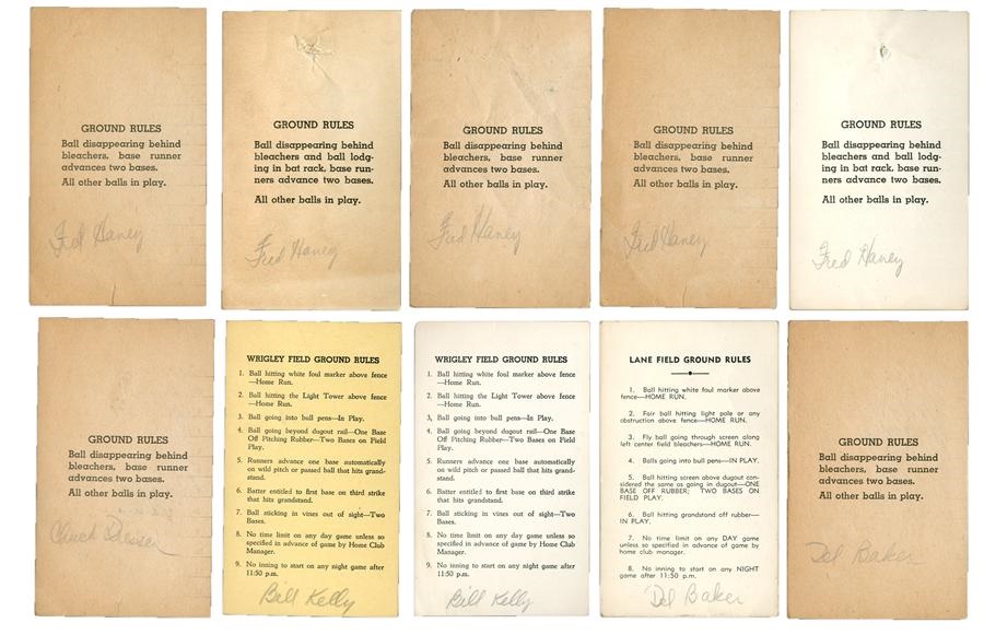 Here's an unusual assortment of 10 lineup cards from numerous managers during 1940s-50s. Each measures 3x5", is handwritten in pencil with batting order on front and signature on verso. Managers included are Chuck Dressen, Bill Kelly (2), Del Baker (2), and Fred Haney (5). One of the Del Baker's has a tear on front, but these are very well preserved overall. Interestingly, the backs also contain "Ground Rules" - most are generic, but two include detailed rules for Wrigley Field, with another from Lane Field in San Diego.