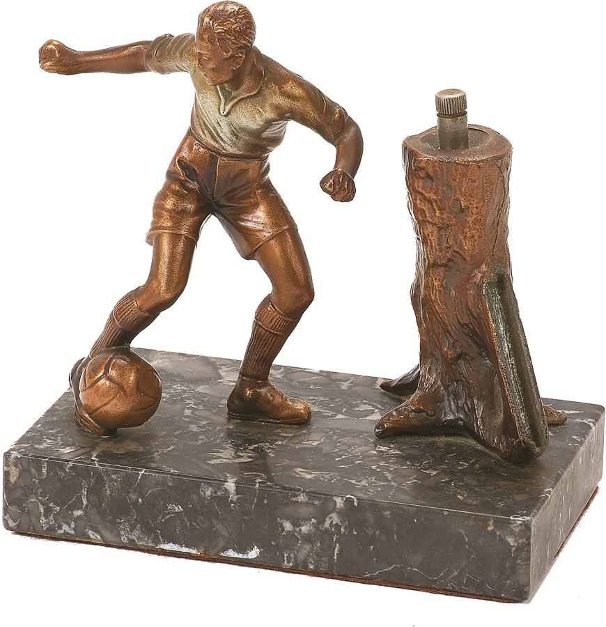 In this unusual figural spelter desktop table lighter from the 1920s, the metal is similar in appearance to bronze. It depicts a soccer player controlling the ball, is affixed to a marble base, and measures 5" high. The tree stump to the right hand side of the figure has the striking pad and the striking wand is held in the top. In extremely nice condition, it rates as EX-MT.