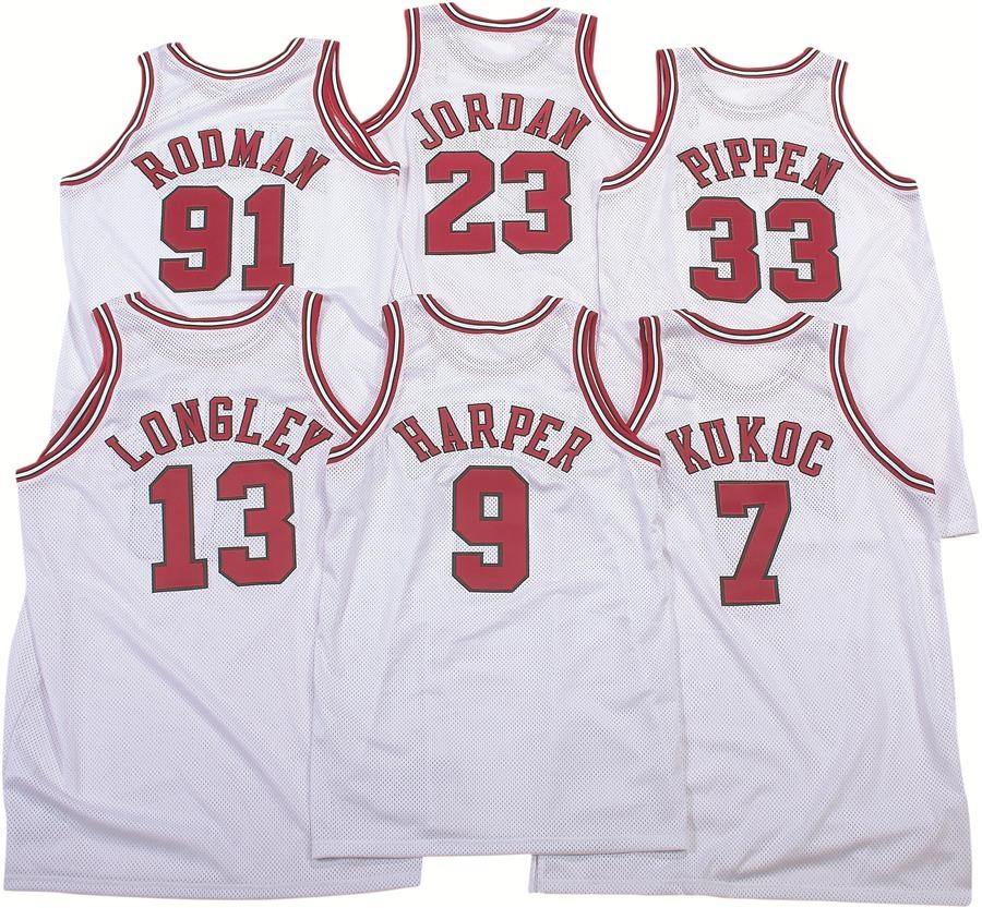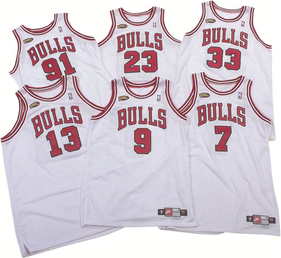 A beautiful half-dozen make up this group of game-issued Chicago Bulls home jerseys from 1998. Each Nike top bears the NBA logo patch on the left shoulder and the NBA Finals patch on the right, with all appropriate names and numbers. This group includes no less than Michael Jordan, Scottie Pippen, Dennis Rodman, Tony Kukoc, Luc Longley and Ron Harper. All have Nike tail tags with appropriate sizes, NBA Authentics, and Bulls logos. Like they just came out of the box, these jerseys present as brand new. The '98 Bulls won their sixth Championship in eight years, outlasting the Utah Jazz in six games.