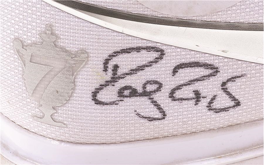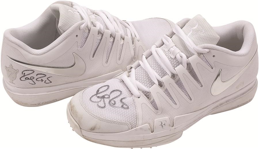 Offered here are the actual shoes that Roger Federer wore to the 2015 Wimbledon Tournament. They are completely customized, and were exclusively made for Federer by Nike. Differing greatly from those offered in stores, both physically and visually, these do not have a size tag as they are custom, but they are roughly a size 12. They have a carbon fiber shank on the bottom, as well as the grass grip pattern on the sole. The RF logo is stitched onto the tongue, as well as the Wimbledon trophy with a number "7" adorning the heel (a reminder of the number of times Federer has won this prestigious tournament). Both shoes are also signed by Roger Federer, and come complete with a COA from the Roger Federer Foundation, also signed by Federer.