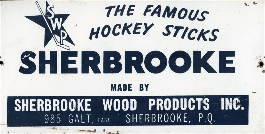 This 12x6" metal sign was used as part of a stick rack display for Sherbrooke hockey sticks. Listing their Quebec address, the bold, black print highlights "The Famous Hockey Sticks SHERBROOKE" with an "SWP" logo for Sherbrooke Wood Products. Circa 1960s, the sign has holes for mounting over your favorite stick display rack, and minor rust around the edges and back only adds to its character. Sherbrooke was one of the early mass-producers of wood hockey sticks.