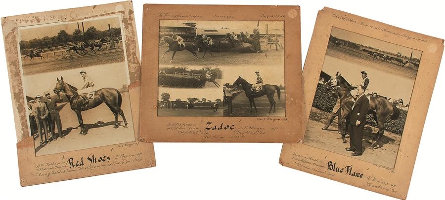 Three great Bert Morgan photos are in this lot, all from 1946 and all matted. 1) Blue Flare, dated July 4, 1946, measures 14x18" with matte, the horse's name is calligraphed beneath with related facts above and below. 2) Zadoc measures 17x15", a great collage of photos blended into one, dated August 6, 1946. 3) Red Shoes, 14x18" with much of the matte missing, a nice split shot of the horse posed and in action. All of the mattes have creasing and some tears, and each has tack holes in the corners, but the photos remain suitable for framing.