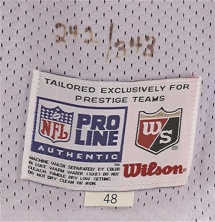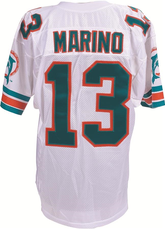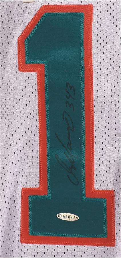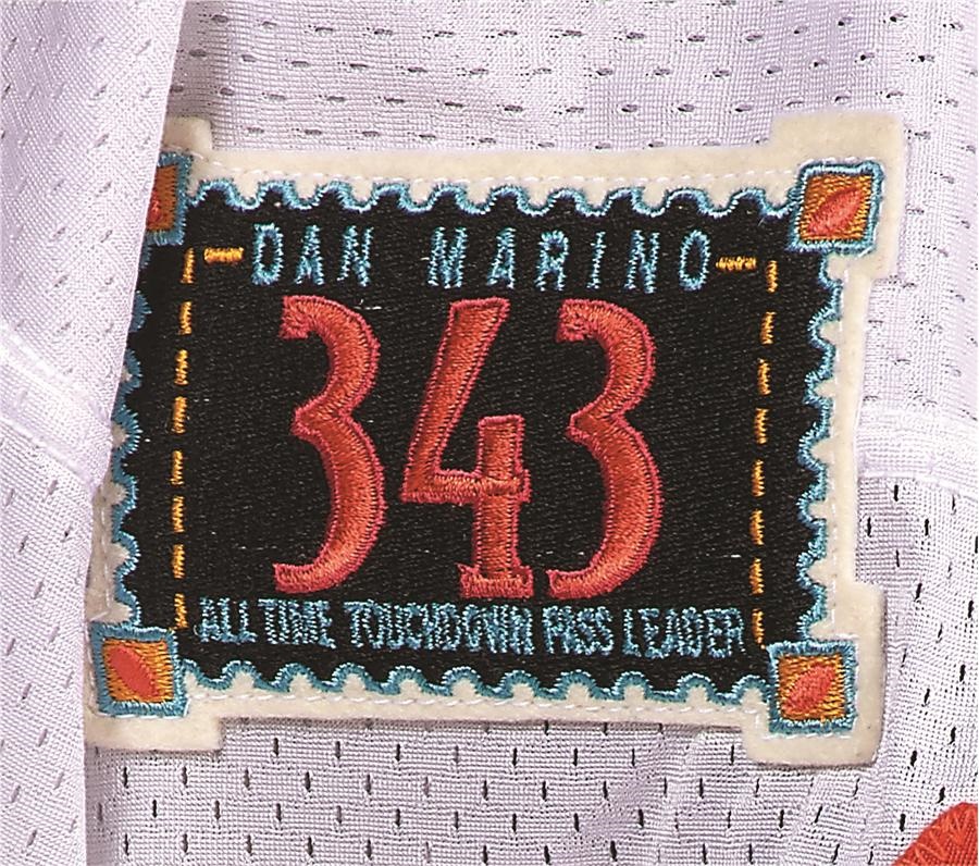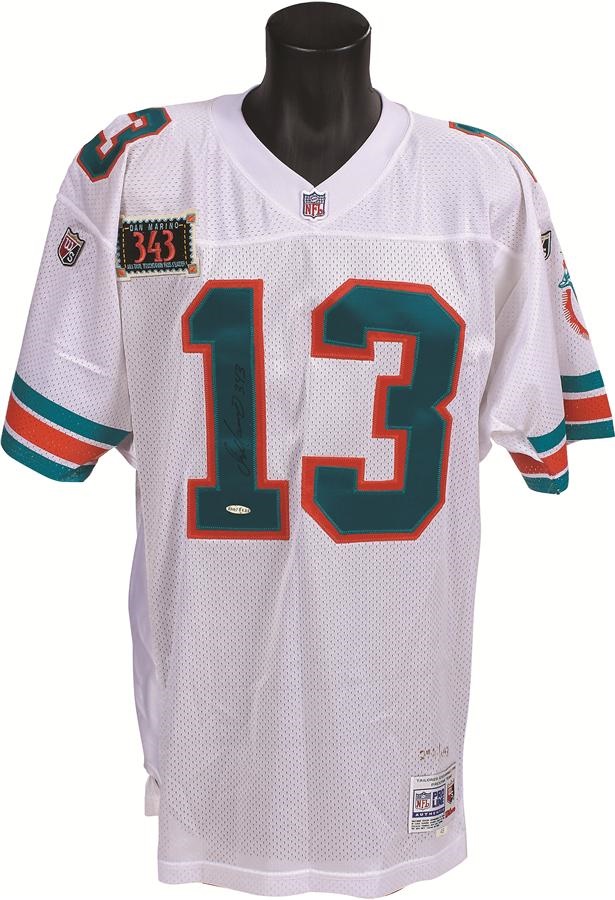 He could be the best quarterback never to have won a Super Bowl, but that setback hardly diminishes the brilliant career of one of the game's most lethal passers - Dan Marino. This white Miami jersey, which is a high quality Wilson replica of a Marino gamer, features a "343 touchdowns" patch on the right side of the chest. It is also signed on the front in 8/10 Sharpie: "Dan Marino 343." There is an Upper Deck authenticated hologram below the signature, as well.