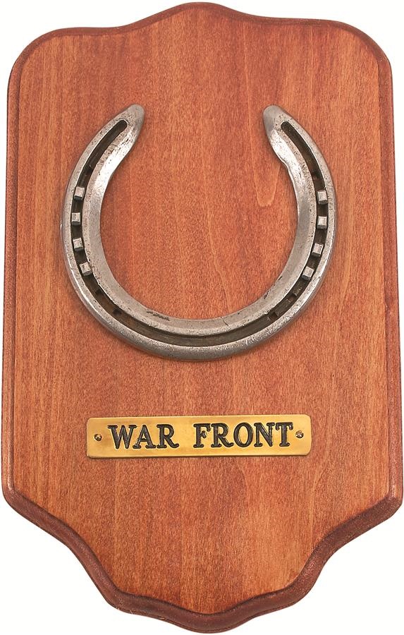 Behold the lucky horseshoe worn by American thoroughbred War Front, who in 2006 captured the Alfred G. Vanderbilt Handicap and finished second in both the Forego Handicap and Vosburgh Stakes. Mounted on a wood plaque that measures 7.5x12", the shoe sits atop a name plate featuring "War Front" in bold letters. The item originates from the venerable Claiborne Farm in Kentucky.