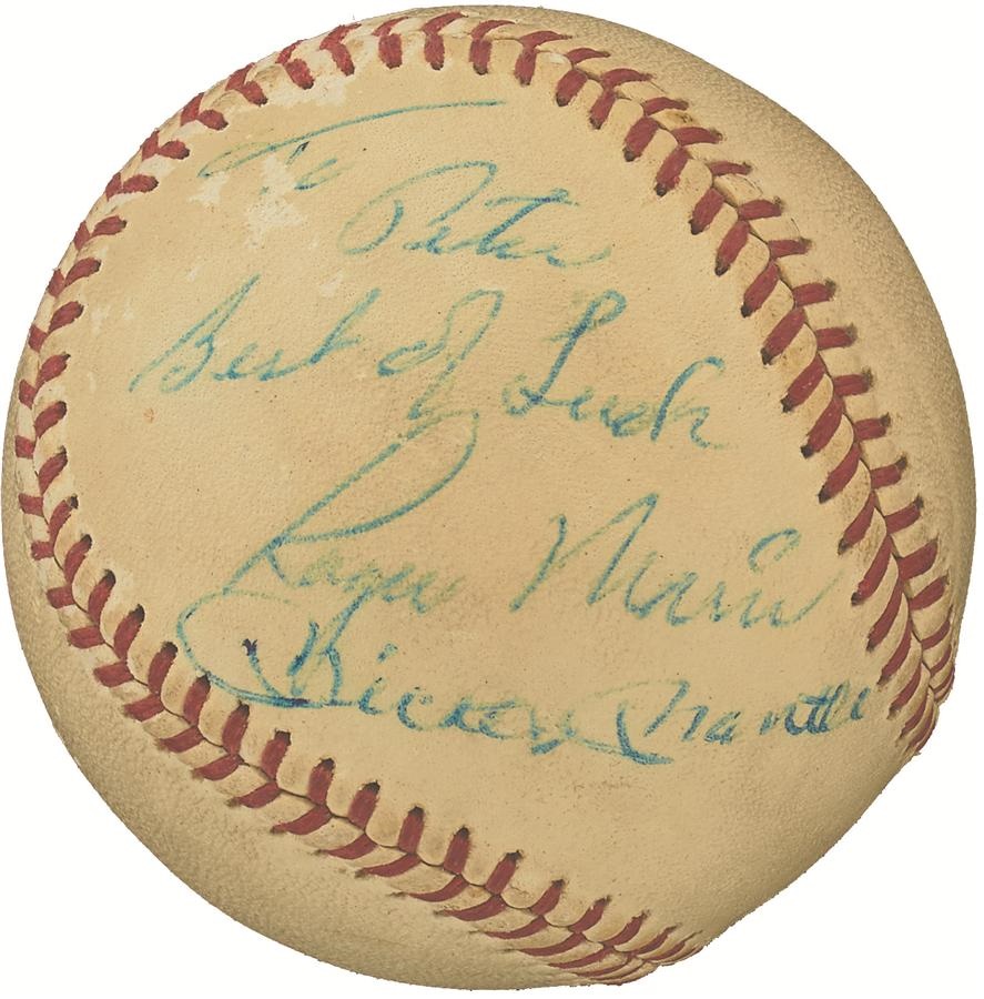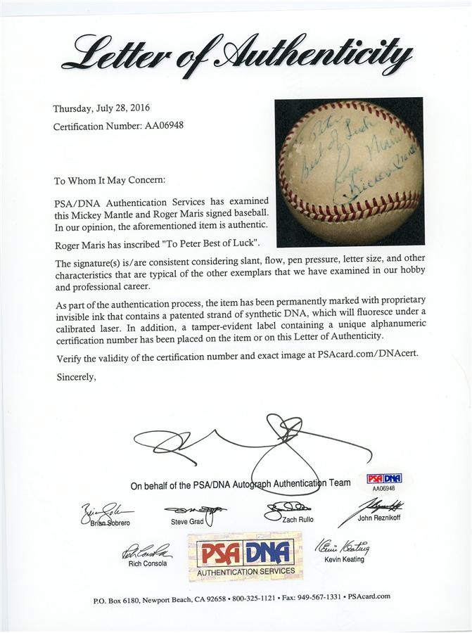 An unusual pair of Yankee greats penned autographs on this ball. Roger Maris and Mickey Mantle have each signed on the same panel in blue ink; Maris has added the inscription "To Peter Best of Luck" above his, with the Mick signing directly below. There is some loss of the surface of this Official American League ball, but that does not diminish the importance of the signatures contained on it, as it is very rare to have just the two greats signing on the same panel. Recalling the days of the "M&M Boys," the Yankee sluggers vied for Babe Ruth's home run record in 1961 and, despite the competition, their friendship lasted for years afterward. Comes with full letter from PSA/DNA.