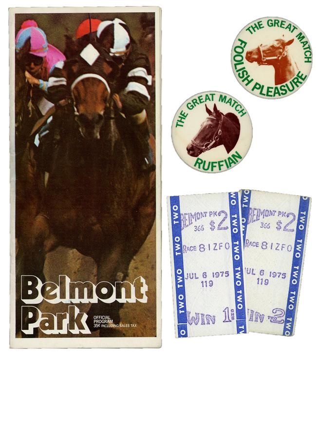 Offered here is a program from the infamous 1975 Match Race between Ruffian and Foolish Pleasure, along with $2 totes and buttons from the race that pitted colt against filly in an equine "Battle of the Sexes." The standard race-day program is in MT condition, with no pencil marks and stark, white pages. The pinbacks, measuring 2.25" in diameter, each highlight one of the participants with "THE GREAT MATCH" above the horse's image, and the name below. The front images are clear and there is some rust on the backs. The $2 win tickets were uncashed, as Ruffian tragically broke down during the race, and was eventually put down.