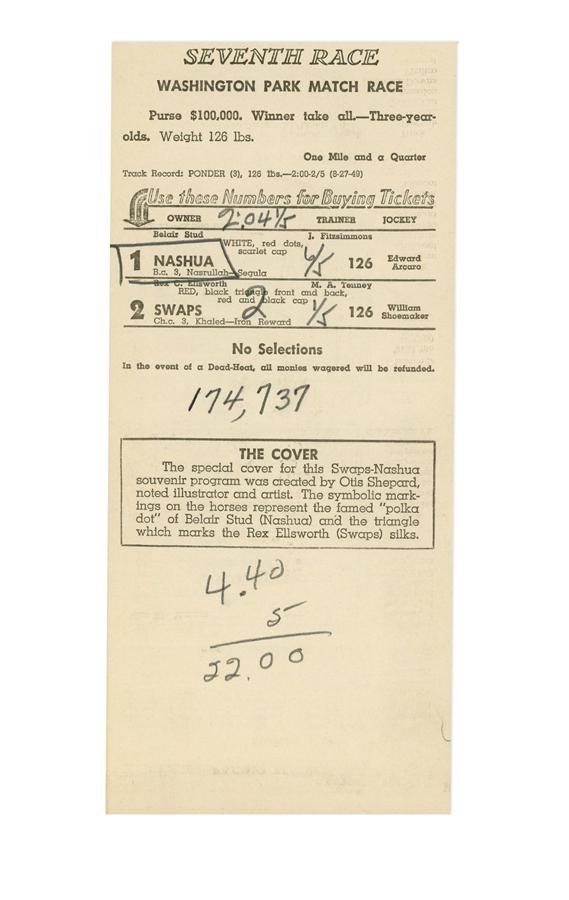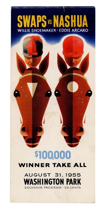 From Washington Park comes this racing program from August 31, 1955, featuring the famous match race between Hall of Famers Nashua and Swaps. The staple-bound program, which folds up, is completely intact and NRMT with a small crease at the top and no visible tears. There is writing inside indicating race finish, scratches, etc. Billed as a "Winner Take All" match race, jockey Eddie Arcaro piloted Nashua to victory, outdueling Willie Shoemaker aboard Swaps.