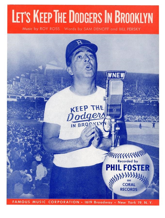 In 1957, Phil Foster crooned the hopes of a generation in imploring ownership to keep the Bums in Brooklyn. This vivid 9x12" booklet contains the actual sheet music for the tune, "Let’s Keep The Dodgers In Brooklyn." Despite catchy lyrics such as "Your mind is in a fog, if you take them to that smog," the pleas of the faithful fell on deaf ears. This memento is in EX condition, with back cover ads featuring song folios from the likes of Bing Crosby and Roy Rogers.