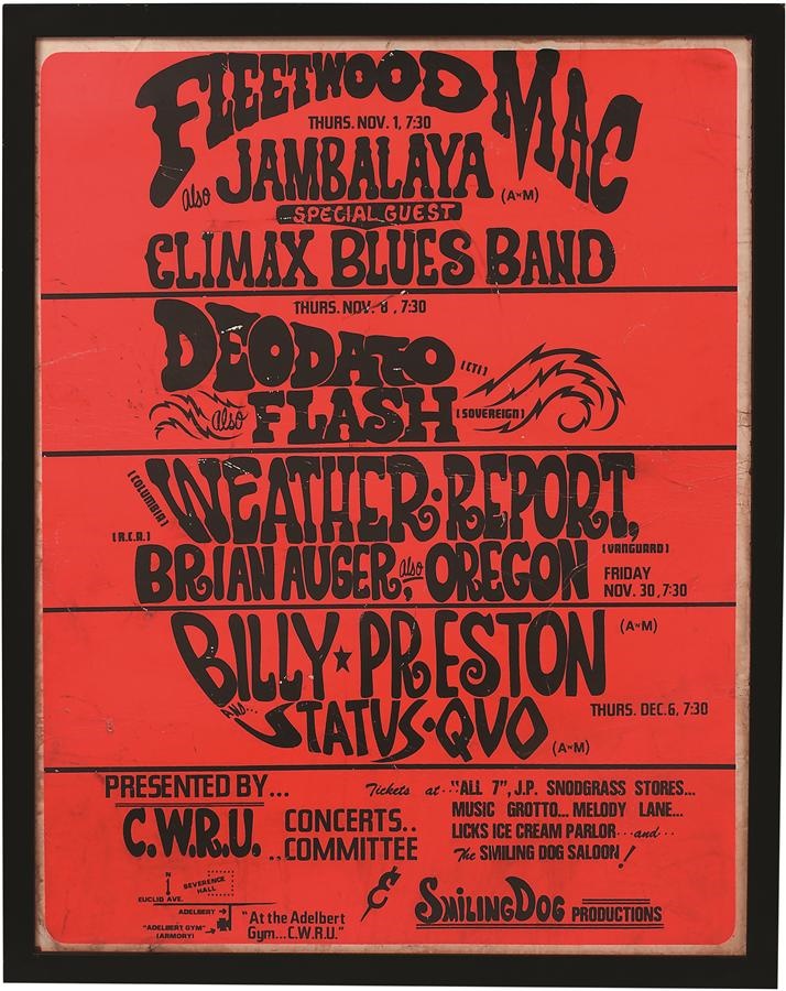 This amazing rare poster bills a concert headlined by Fleetwood Mac on Nov 1, 1973, at the the Adelbert Gymnasium at Case Western Reserve University in Cleveland, OH. Measuring 24x39", it sports a florescent orange background and the color is very vivid, the cardboard poster has some creases and surface abrasions but presents nicely and is in EX condition. This was a very tumultuous period for Mick Fleetwood's troupe, but just two years later he would recruit Stevie Nicks and Lindsey Buckingham, and the rest is musical history.