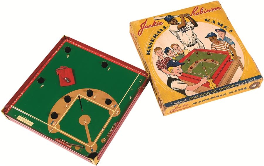 From Jackie Robinson's second big-league season of 1948, this baseball game manufactured by the Gotham Pressed Steel Corporation features a metal playing field on top in nice condition. The game measures about 14x14" and has had some restoration, as well as inner cardboard added to firm up the box and replace the one side that's missing. There are also some nicks and tears as shown. The game is functional and features the original balls.