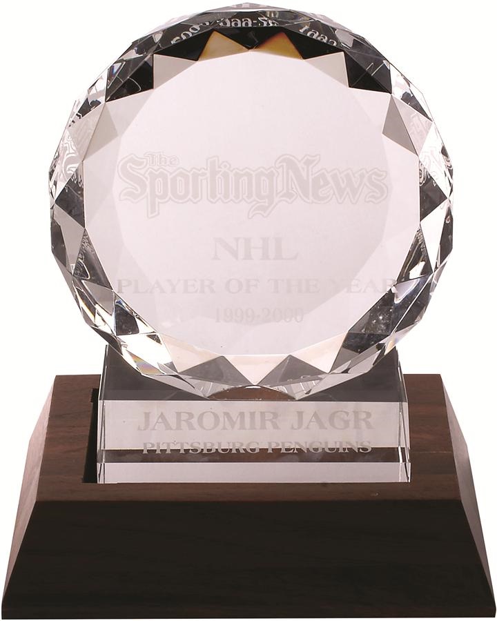 This trophy was awarded to Jaromir Jagr as NHL Player of the Year from The Sporting News. It is in the form of crystal with a wood base, and etched in the crystal is "The Sporting News, NHL Player of the Year 1999-2000, Jaromir Jagr, Pittsburgh Penguins." The etchings are on different parts of the glass, giving it a great 3-D look. The wood base measures 7x5" and 2" high, with a rectangular felt cutout on top on which the crystal rests. It comes with the original box for the crystal, and also original mailing box and label from the Sporting News to Jagr. In NRMT condition, this is a simply gorgeous award and a piece of history related to the man who will go down as one of the game's all-time greats - if he ever retires.
