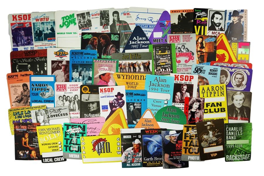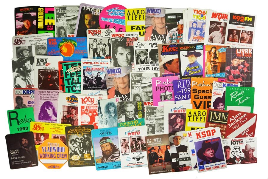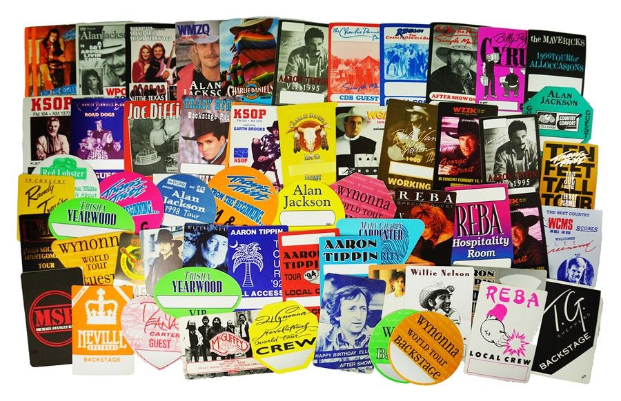 This incredible lot of 225+ original Mint and unused backstage passes coms from various great various bands and performers, all from the realm of Country. Includes multiples of The Judds, Hank Williams, Reba, Wynonna, Willie Nelson, Charlie Daniels, Waylon Jennings, Tim McGraw, George Jones, Garth Brooks, Kenny Rogers and many many more. There are some dupes, some unlaminated laminates and a couple are laminated. We obtained these passes directly from the original manufacturer, Otto, still the major manufacturer of concert passes and tickets to this day.