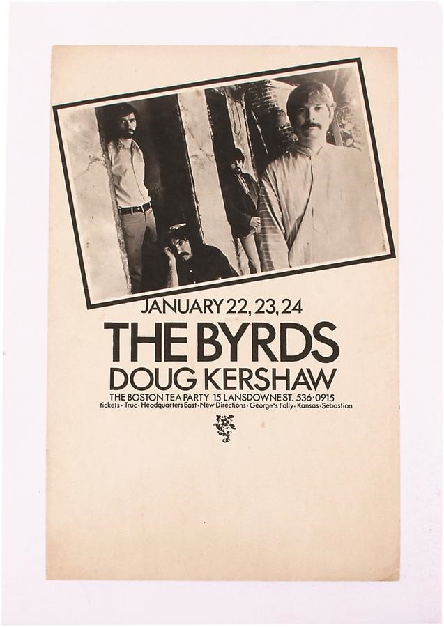 This poster heralds the 1969 Boston Tea Party Concert featuring the Byrds and Doug Kershaw. The simple design of the 11x17" classic consists of an angled black & white image above the performers' names, and the January 22-24 appearance dates. It has been mounted on linen to 14x20.5" and has very slight edge discoloration and one small crease on the bottom right corner, but still rates in EX condition.