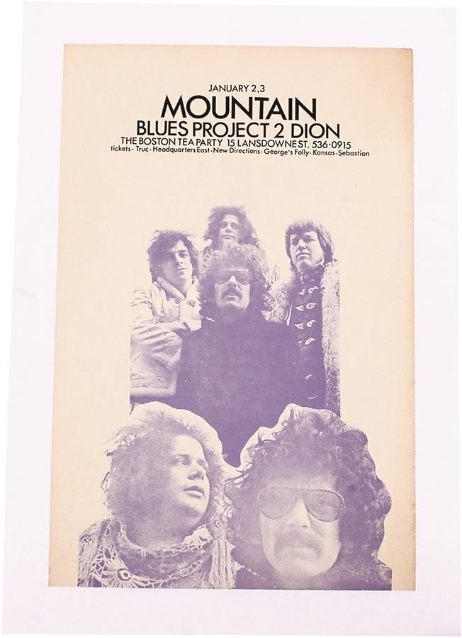 Having been formed only a year before, the band Mountain was already gaining steam before this headline performance heralded for the Boston Tea Party on January 2-3, 1970, with Blues Project 2 and Dion opening. A great shot of an early iteration of Leslie West's band is featured on a white background, and the 11x17" poster, mounted on linen to 14x20" is in solid EX-NRMT condition, with only slight yellowing at the edges preventing this from being a perfect specimen.