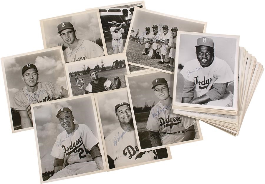 A fabulous 50 photos is included in this lot, including many Brooklyn Dodgers all-time greats. While they are ghost-signed (many likely by Dodger batboy Charlie DiGiovanni), these are all beautiful Type I Barney Stein vintage 8x10" photos, with his stamp on the verso of some. All are in EX-MT condition, and the luminaries include: Campanella (two variations), Robinson (two variations), Reese, Snider, Koufax, Erskine, Hodges, Craig, Newcombe, Amaros, and many more. There are a few duplicates but a great selection of Dodgers is represented here.