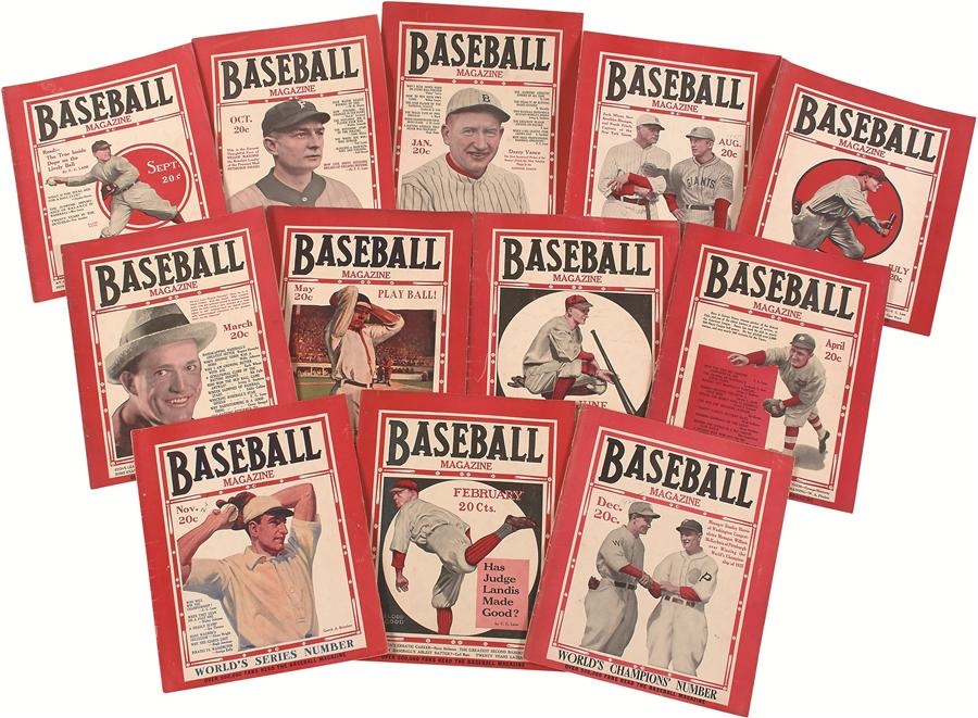From 1925, this complete run of Baseball Magazine includes some great covers: Dazzy Vance of Brooklyn, Hornsby photo cover, Bill McKechnie and the 1925 Pirates, Frankie Frisch & Zack Wheat of the Giants & Brooklyn. Overall VG-EX condition.