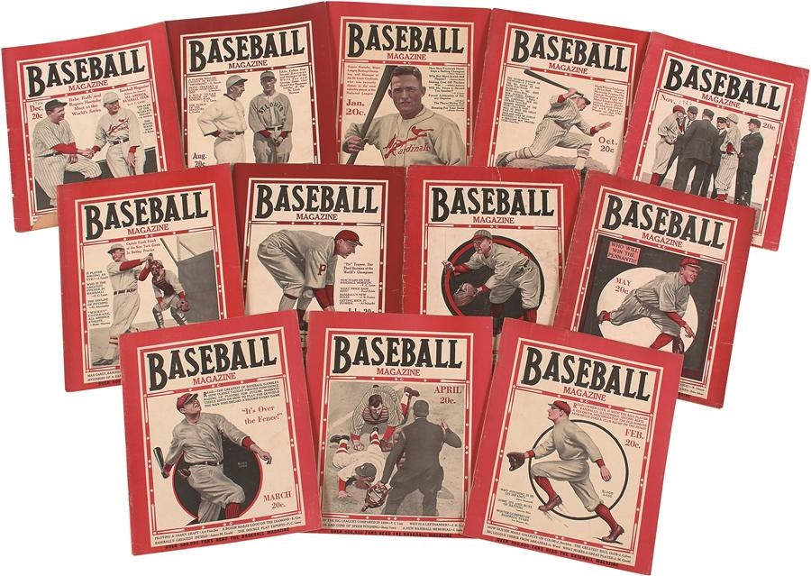January leads off this complete run of Baseball Magazine from 1926 with Rogers Hornsby in his greatest year and December ends with Babe Ruth & Horsnby "Meet At The World Series." Covers: Frankie Frisch, Pie Traynor, Eddie Collins & George Sisler, Hack Wilson dodging beanball, and "World Series Number." Overall VG-EX condition.