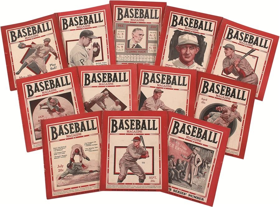 This complete Baseball Magazine run covers the year 1929, with stunning covers that include "Burleigh Grimes Spitball King," Mickey Cochrane, Connie Mack "World Champions Number" and "World Series Number." Overall VG-EX condition.