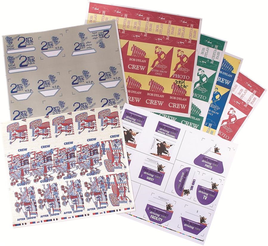 This is an incredible collection of backstage pass uncut sheets: Bob Dylan (5), Paul McCartney (2), Allman Brothers, Jefferson Airplane (2), Neil Young Crazy Horse. These are pretty much one-of-a-kind (all are different), as they were used to sign off on design approval, some with the actual interoffice signatures. All were obtained directly from Otto Printing and Entertainment, who still produces the passes and tickets to this day.