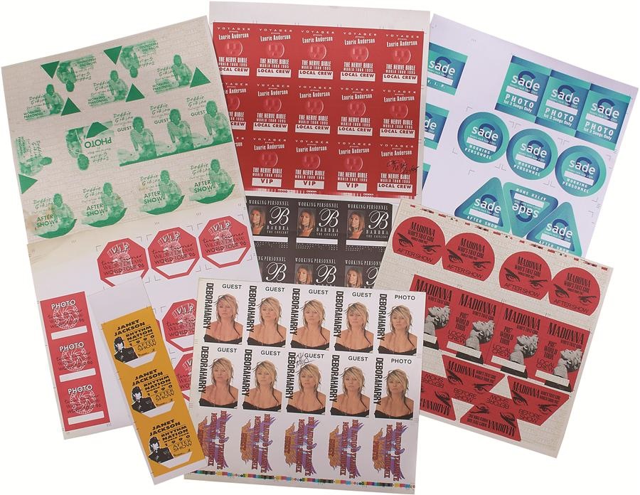 This fabulous collection of backstage pass uncut sheets highlights some of the greatest female artists: Barbara Streisand, Alanis Morissette, Tina Turner, Madonna, Janet Jackson, Deborah Harry, Tori Amos (4), Sade, Laurie Anderson, Deborah Gibson. These are pretty much one-of-a-kind, as they were used to sign off on design approval, some with the actual interoffice signatures. All were obtained directly from Otto Printing and Entertainment, who still produces the passes and tickets to this day.