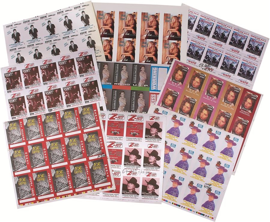 This is a gigantic collection of backstage pass uncut sheets of the greats of country music: Johnny Cash/Tammy Wynette, Willie Nelson, Faith Hill, Brooks & Dunn, Alan Jackson, Ricky Van Shelton, Hank Williams Jr (2), Clay Walker (2), Martina McBride, Reba (John Wayne "True Grit" illustration), John Berry, Ricky, Scaggs, Charlie Daniels, Rickie Lee Jones/Lyle Lovett (3), Michelle Wright, LeAnne Rimes, Reba, Joe Diffie, Lorrie Morgan, 1993 & 1994 Country Music Cares (2), George Strait (3), CDB MT Juliet Tennessee, Tim McGraw, Alabama, Chris Buckley, Al Denson & Amy Grant. These are pretty much one-of-a-kind, as they were used to sign off on design approval, some with the actual interoffice signatures. All were obtained directly from Otto Printing and Entertainment, who still produces the passes and tickets to this day.