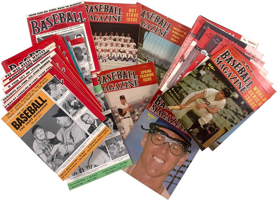 Some of these issues of Baseball Magazine from the 1950s are the toughest to find because the magazine was struggling. Covers include Babe Ruth Anniversary issue and early Mickey Mantle. 1952: Jan, Mar-May, Jul/Aug, Oct, Nov/Dec. 1953: Spring, May thru Nov. 1954: Aug three Sept, Christmas. 1955: May thru July. 1956: May, Jun, Jul, Oct. 1957: May, Sept. Rare color covers, some high grade: Nov 1964, Dec 1964, Jan 1965, Feb 1965, Mar 1965, Apr 1965. Some high grade stuff here overall EX, a total of 37 issues.