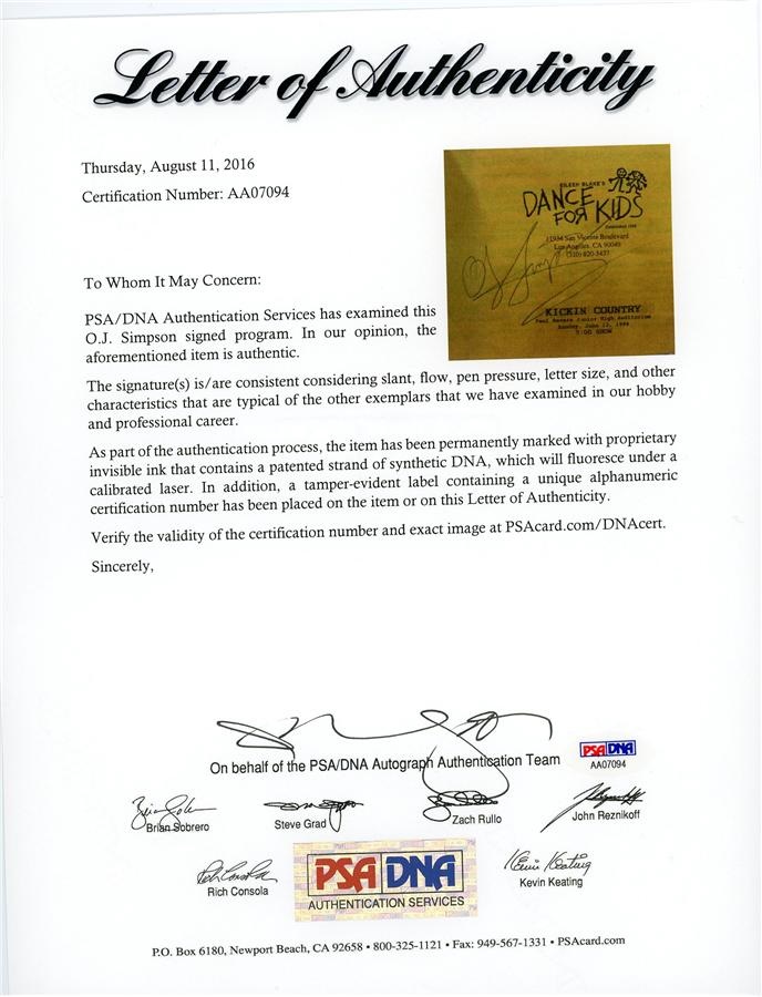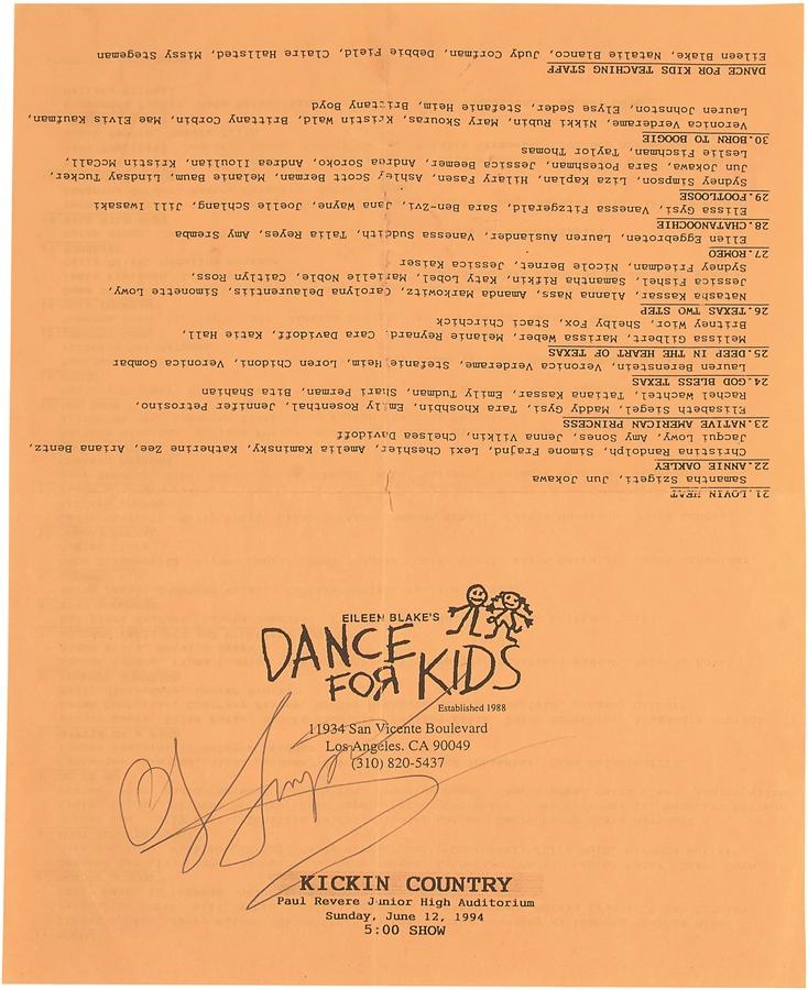 June 12, 1994 - the date of the "Crime of the Century" as O.J. Simpson's estranged wife, Nicole, and her friend, Ron Goldman, were viciously murdered at her home in Brentwood, California. Earlier that very same day, the Hall of Fame running back and Heisman Trophy Award winner signed this flyer in what may just be his last autograph prior to the murder for which he was found liable in a civil trial. The 8x10" leaflet was signed at a middle school dance for kids at Paul Revere Junior High. Comes with full PSA/DNA LOA.