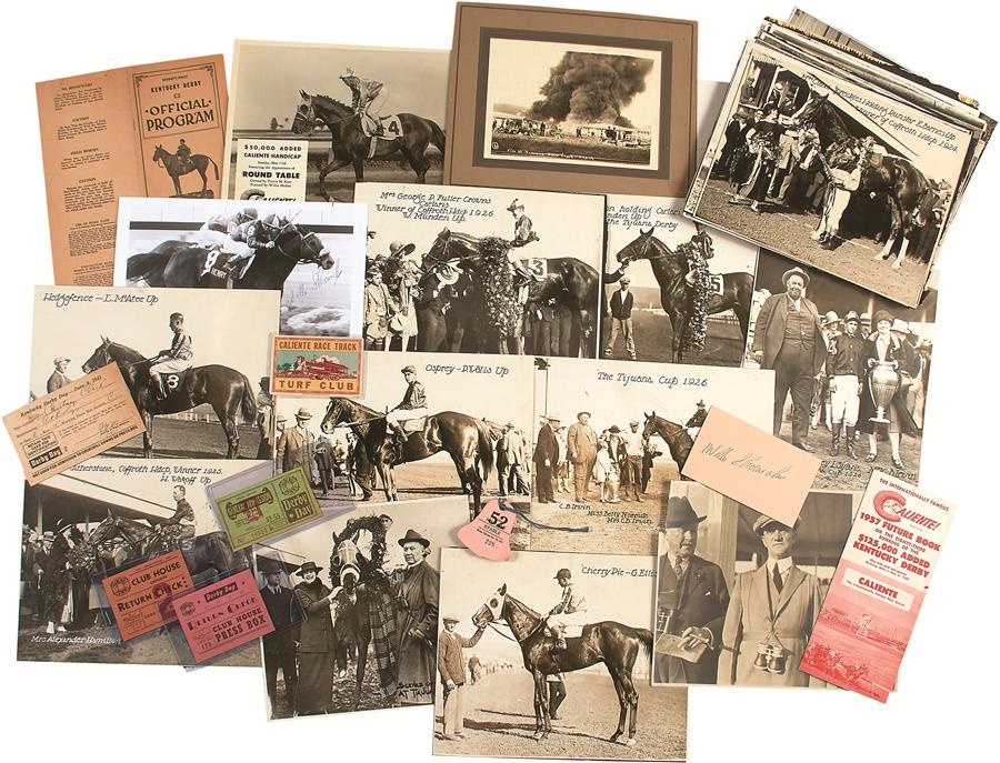 A wonderful cross-second of racing ephemera, this lot includes: Autographs - Earl Sande signed cut, Willie Shoemaker signed 3x5" and Shoemaker signed 8x10" photo. Tickets: 1945 Kentucky Derby Press Pass ticket and stub, Churchill Downs clubhouse press box ticket, 1945 Kentucky Derby clubhouse grounds pass. 1925 Caliente Turf Club owner's pass signed by owner, 1951 Caliente Race Track Turf Club season pass. 1957 Caliente Future book with Kentucky Derby, 1945 Kentucky Derby program. 61 original photos from the 1920s including: Earl Sande, Fire at Barnes Tijuana race track 1924, Tijuana Cup winners, J.W Coffroth 1926 Tijuana Cup, Coffroth Handicap races, C.B Irvin, 1958 Caliente Handicap photo with original envelope. The lot also includes three photos of Jack Dempsey: 1925 Coffroth Handicap with Silver Cup, Dempsey/Coffroth/Oldfield, Dempsey & Coffroth at 1924 Coffroth Handicap.