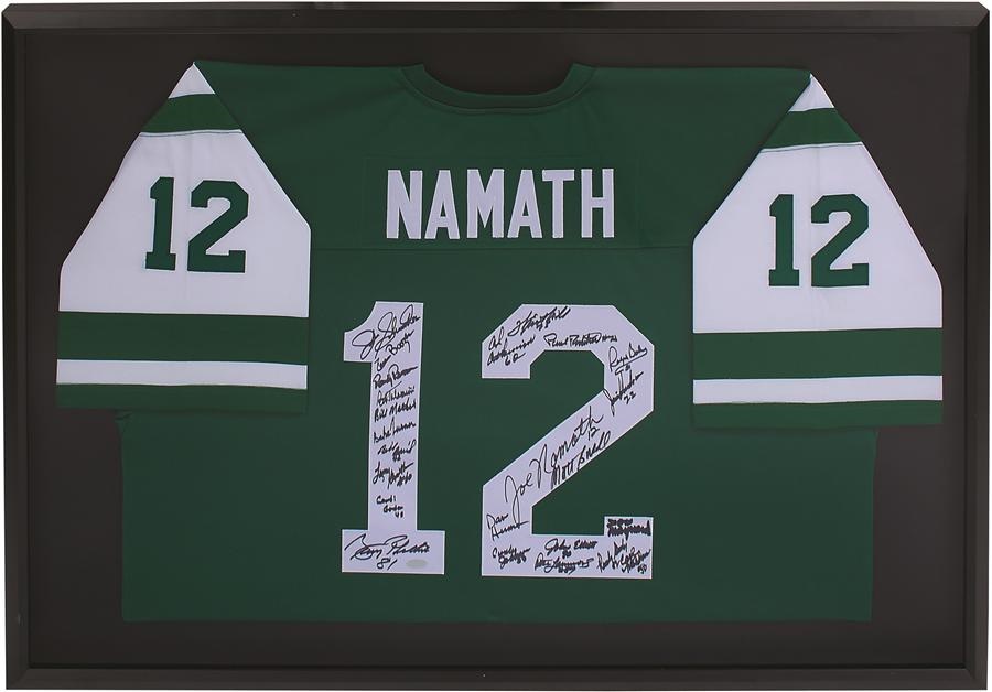 A fitting tribute to the man who made The Guarantee, this framed Joe Namath jersey is signed by 25 members of his history-making 1969 New York Jets Super Bowl winners. Measuring 30x42" with frame, signatures in black marker along Broadway Joe's iconic white number 12 include: Namath, Boozer, Maynard, Snell, Philbin, Rochester, Baker, Hudson, Hill, Atkinson, Schmitt and more. This classy piece comes with Steiner Sports COA.