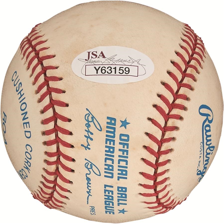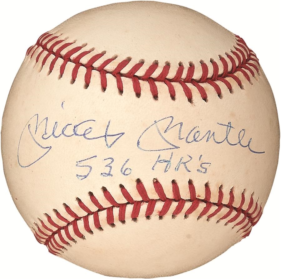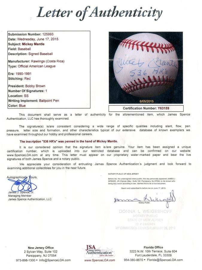 He ranks 17th on baseball's all-time home runs list, and Mickey Mantle referenced his round-tripper total on this signed, Official American League (Brown) baseball with "536 HR's" inscription. Comes with JSA LOA.