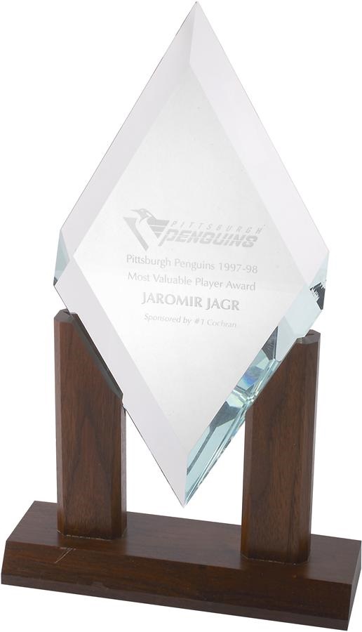 This beautiful and unusual award is comprised of etched glass which sits freely upon a wooden base. On the diamond-shaped glass is etched "Pittsburgh Penguins 1997-98 Most Valuable Player Award JAROMIR JAGR," and also listed is the sponsor of the award "#1 Cochran." The base measures 8.5x3" and is 7" high. The glass diamond measures 6.5" across and 12" high and both pieces are in NRMT condition. Sure to be considered one of the best of all time, the man known as "JJ" continues to produce in the NHL at the age of 44.