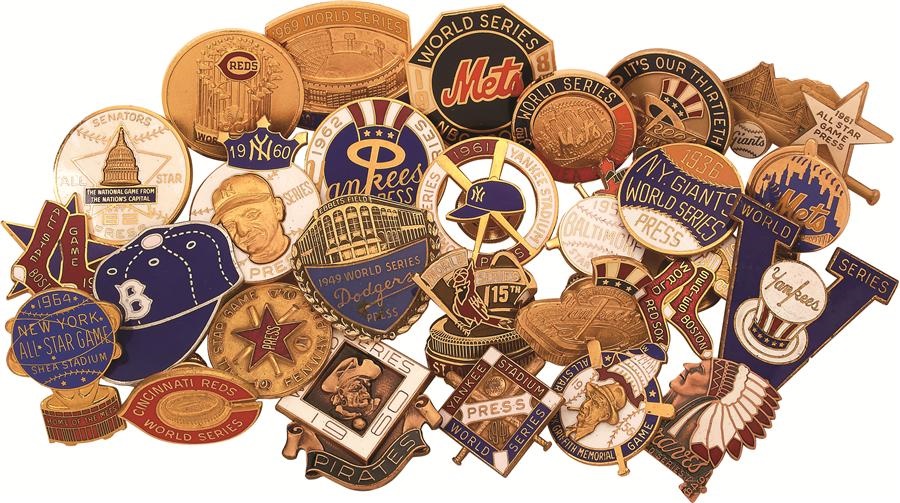 Nearly six-dozen varied World Series and All-Star press pins distinguish this outstanding assortment of artifacts. Here's how it all breaks down: All Star: 1946, 1956, 1958, 1961-64, 1969, 1982, 1984 (2), 1986, 1989, 1991-92, 1994, 1999. World Series pins range from 1936-2007. From the Yankees: 1941, 1953, 1960, 1961, 1962, 1963, 1964, 1976 (white & gold), 1978 and 1981. There are two from the Brooklyn Dodgers: 1949 and 1953. Other notables include: 1936 Giants, 1960 Pirates, 1969 Mets, 1986 Mets, 1986 Mets NBC, plus the 2004 and 2007 Red Sox.
