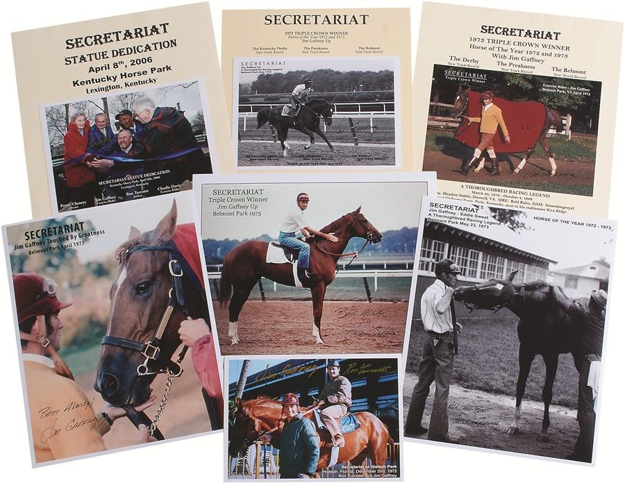Among the names associated with the great Secretariat, Jim Gaffney might not be familiar, but as the exercise rider of the historic thoroughbred, he enjoyed a great connection. All of these 65 photographs are signed by Gaffney and from his personal collection. Additionally, four are signed by Charlie Davis, and four by Ron Turcotte. Of the lot, 19 photos are 5x7" and rest are 8x10" - some are affixed to 9x11" paper with Secretariat's stats. Aside from a couple with the trainer aboard Angel Light, the vast majority depict him with perhaps the greatest racehorse of all time.