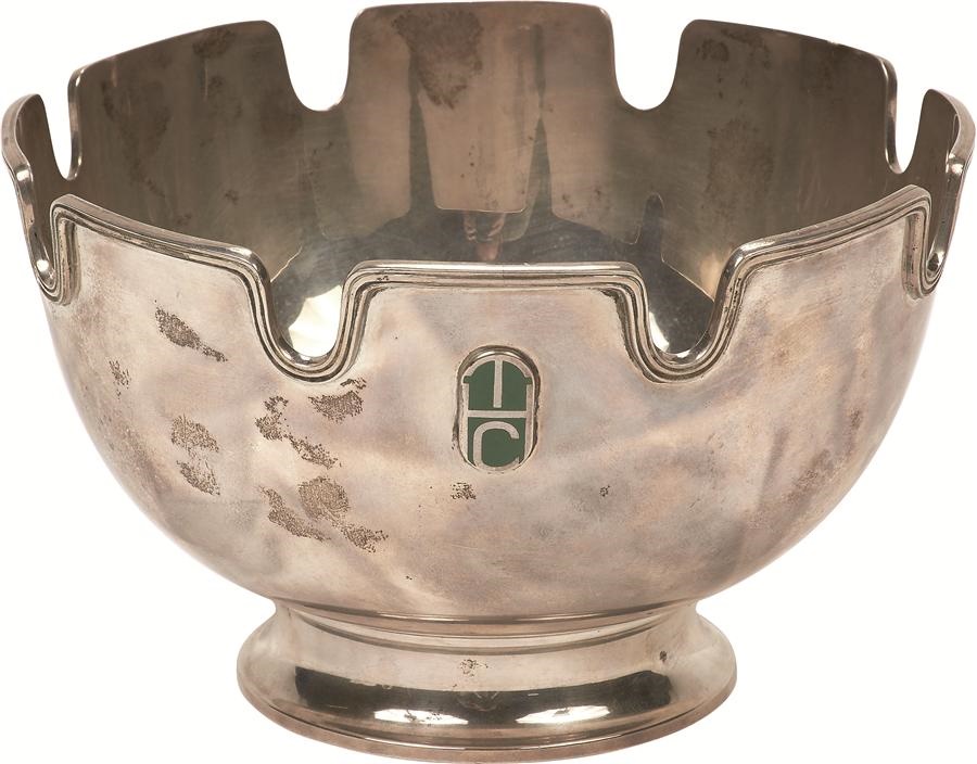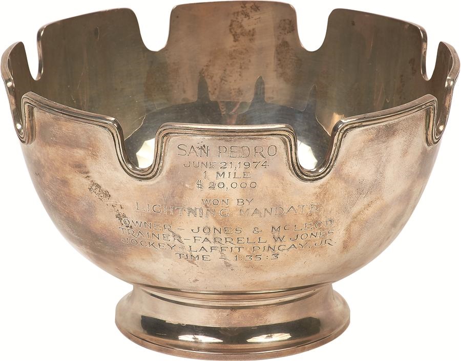 Up for auction is this one-of-a-kind horse racing trophy, presented to the owners of Lightning Mandate for winning the "San Pedro" on June 21, 1974, at Santa Anita with Hall of Fame jockey, Laffit Pincay Jr aboard. This beautiful trophy/bowl was crafted by Tiffany and Co. and weighs 17.3 ounces. The base measures 3.5" and the top is 7" in diameter, and it has the race info including winner, time, and jockey all engraved on the bowl. There is a green enamel "TC" logo mark on the opposite side and shows slight tarnish but no visible scratches or dents, and is overall in EX condition.