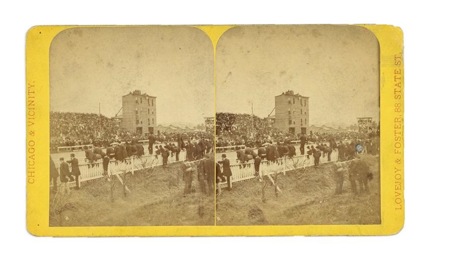 Rating as the best horse racing stereocard we have owned, this 3.75x7" card is from the "Chicago & Vicinity Series" by Lovejoy & Foster, with their address of 88 State Street, Chicago, Illinois on the front. It displays the historic Dexter Park, circa 1870s, and shows people in the grandstand and sitting on foreground fence, as well as the race track. The structure pictured is a large one, possibly the Starter's Building. On back of the card, which is in EX condition, "Dexter Park" is written in script. Built in the years following the Civil War, Dexter Park was also the home of the 1870 Chicago White Stockings baseball team.