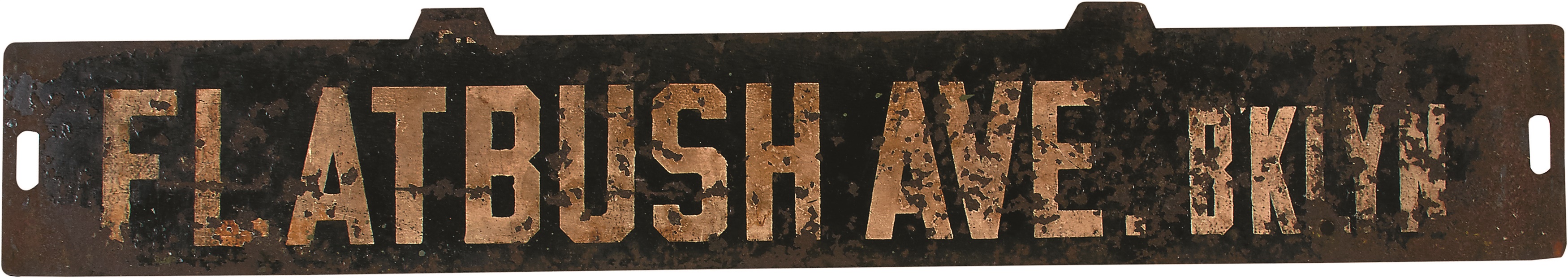 From the era of the 1913 opening of Ebbets Field, this sign points to the central artery for the borough of Brooklyn, Flatbush Avenue, which runs from the Manhattan Bridge to Jamaica Bay. This vintage metal sign graced one of the avenue's intersections, where it hung above its residents, pedestrians and motorists for several years. Measuring over 25" wide, the sign reveals lots of character with layers of black paint and yellowed white hand-painted lettering. It is double-sided, with one side better than the other.